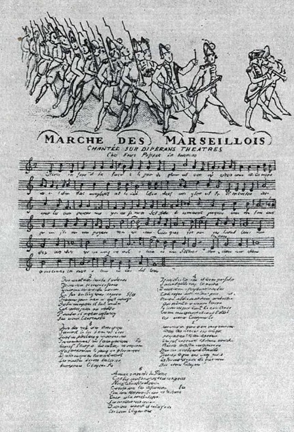 Эта новая социальная функция муз. иск-ва (оно превратилось в активное средство гражд. воспитания, в обществ. силу, служившую интересам гос-ва) способствовала утверждению массовых жанров — песни, гимна, марша и др. В первых франц. революц. песнях использовалась музыка популярных напевов, уже бытовавших в народе: напр., песня франц. санкюлотов «Ça ira» — это своеобразное переинтонирование мелодии «Национального карийона» Бекура. Широкое распространение получили также песни, обобщившие характерные интонации нар. музыки, — «Карманьола» и др. Высоким, наиболее ярким образцом революц. песни Франции служит «Марсельеза», созданная К. Ж. Руже де Лилем (1792; с 1795, с перерывом, — Нац. гимн Франции). Возрождение в музыке героич. образов, обращение к массовой аудитории вызвали к жизни иск-во революц. классицизма. Идеи борьбы с тиранией, свободы человеческой личности, питавшие муз. иск-во, способствовали поискам новых муз.-выразит. средств. Для вок. и инстр. музыки (разных авторов) типичными становятся ораторские интонации, мелодия, отличающаяся «крупными контурами» (зачастую содержащая фанфарные интонации), чеканные ритмы, маршевость, суровая лапидарность ладово-гармонич. склада. Крупнейшие композиторы того времени — Госсек, Э. Мегюль, Ж. Ф. Лесюэр, Л. Керубини, обратились к написанию песен, гимнов, маршей («Песня 14 июля», хор «Пробудись, народ!», «Скорбный марш» для дух. оркестра и др. произв. Госсека; «Походная песня», «Песня победы» Мегюля, «Песнь триумфов Французской республики», «Гимн 9 термидора» Лесюэра; «Гимн братству», «Песни Десятого августа» Керубини). Эти композиторы были виднейшими муз. деятелями Великой франц. революции, в частности они руководили устройством грандиозных массовых муз. празднеств (дирижировали хорами, оркестрами на площадях Парижа). Одним из создателей муз. стиля революции является Госсек, творчество к-рого положило начало новым жанрам, в т. ч. революционно-патриотич. массовой песне, героич. траурному маршу, агитац. опере революции. Он явился также родоначальником франц. симфонии (1-я симфония, 1754). Опираясь на достижения франц. оперы (прежде всего Рамо), Госсек обновил и расширил состав симф. оркестра (ввёл в партитуру кларнеты и валторны). Обществ. атмосфера эпохи оказала значит. влияние и на муз. т-р. Революц. идеология способствовала возникновению новых жанров — апофеозов, агитац. спектаклей с использованием больших хор. масс (Госсек — апофеоз «Дароприношение Свободе», 1792; опера «Триумф Республики, или Лагерь при Гранпре», 1793; Гретри — агитац. оперы «Республиканская избранница, или Праздник добродетели», «Тиран Дионисий», обе 1794, и др.).