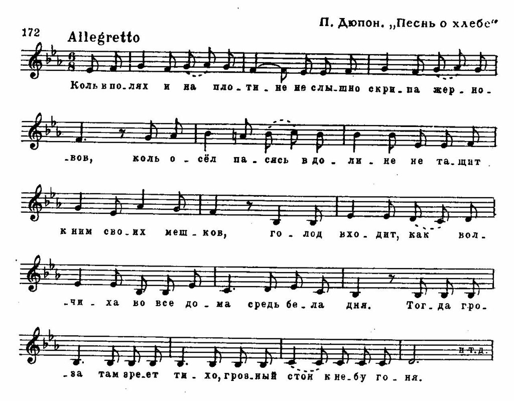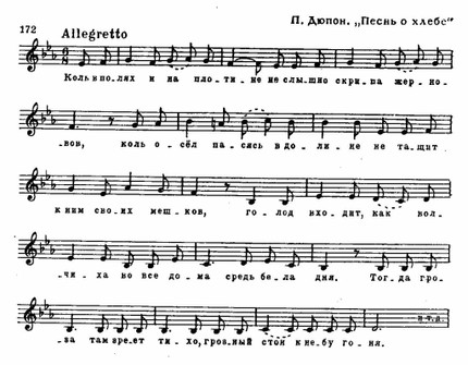 Она действительно нашла этот путь. Множество песен, пробуждая классовую сознательность рабочих, приобрели широчайшую популярность. Среди этих подлинно народных произведений — рожденная в преддверии революционного восстания 1848 года «Песнь о хлебе» Пьера Дюпона и созданный несколько десятилетий спусти как отклик на события Парижской коммуны величайший художественный памятник ее героическим деяниям — «Интернационал» Эжена Потье — Пьера Дегейтера.
