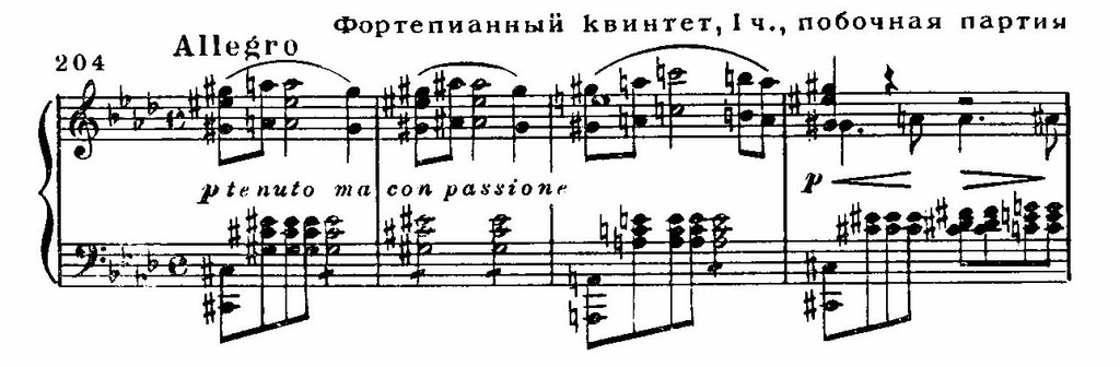 Аналогичны приемы образно-драматургического объединения частей и в квинтете: так, страстно-лирическая тема побочной партии первой части (см. пример 204) вплетается во вторую и третью части, где приобретает героически-призывный характер: