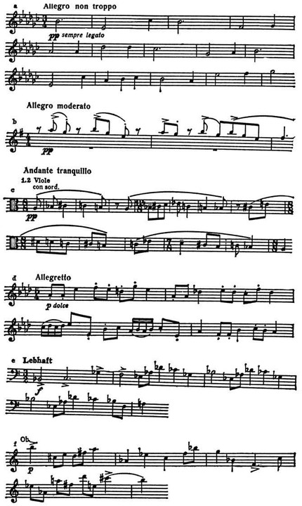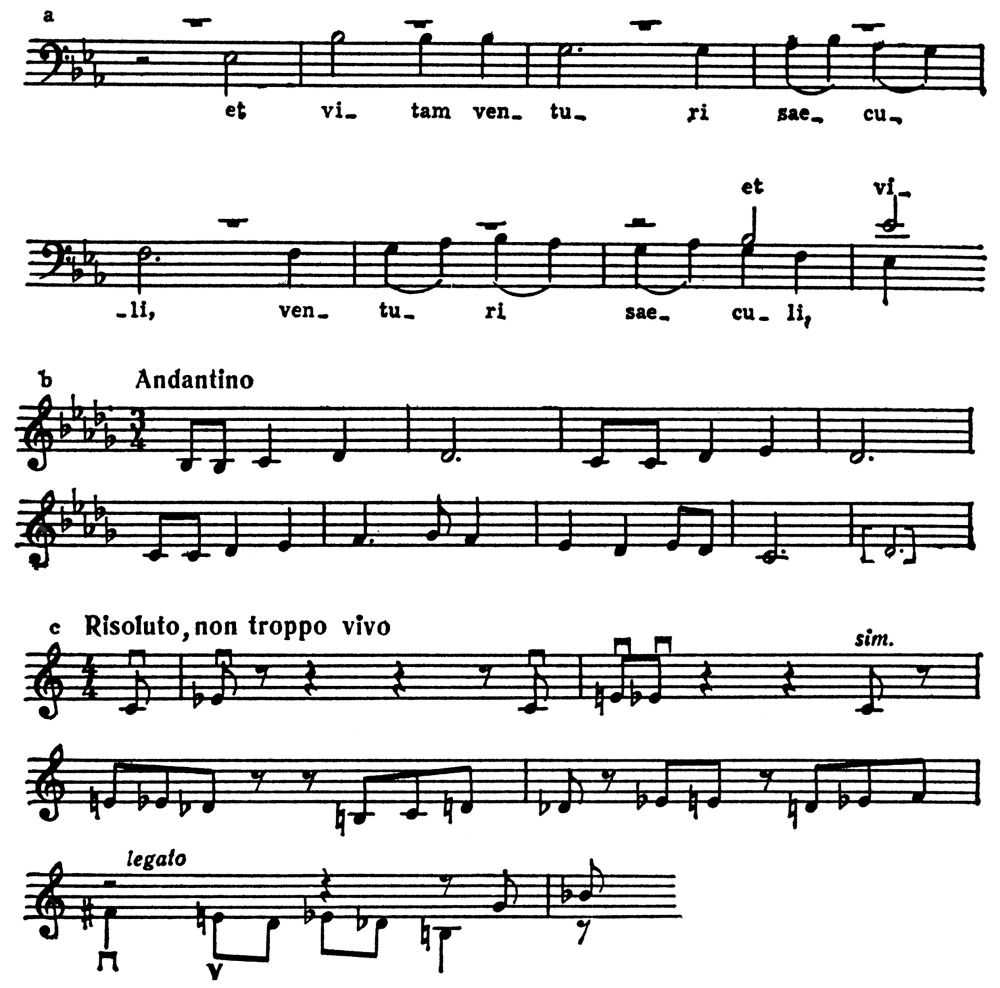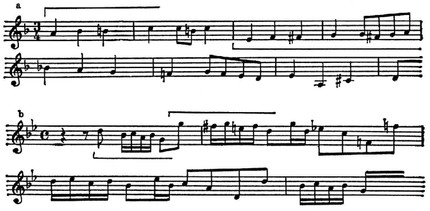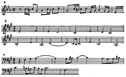 Контрастными считаются темы, основанные на противопоставлении мелодически и ритмически различающихся мотивов (см. пример ниже, а); глубина контраста увеличивается, когда один из мотивов (чаще начальный) содержит ум. интервал (см. примеры в ст. Свободный стиль, колонка 891).