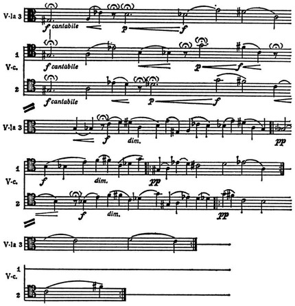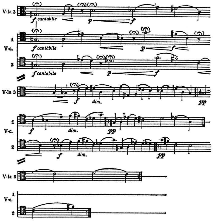 В. Лютославский. Прелюдии и фуга для 13 струнных инструментов, тема фуги.