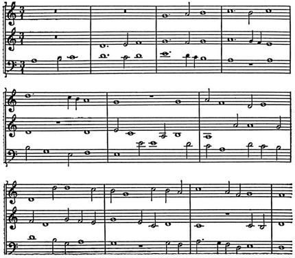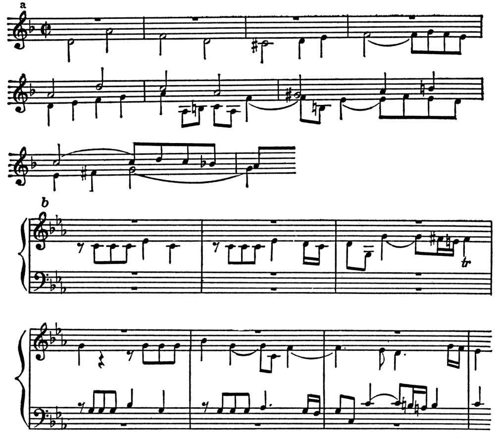 Однако большинству тем свойственна зависимость от лежащей в их основе гармонич. последовательности, к-рая «просвечивает» сквозь мелодич. рисунок; в этом, в частности, проявляется зависимость Ф. 17–18 вв. от новой гомофонной музыки (cм. пример в ст. Свободный стиль, колонка 889). В темах заключено скрытое многоголосие; оно обнаруживается как нисходящая метрически-опорная линия (см. тему Ф. c-moll из 1-го тома «ХТК»); в нек-рых случаях скрытые голоса развиты настолько, что внутри темы образуется имитация (см. примеры a и b).