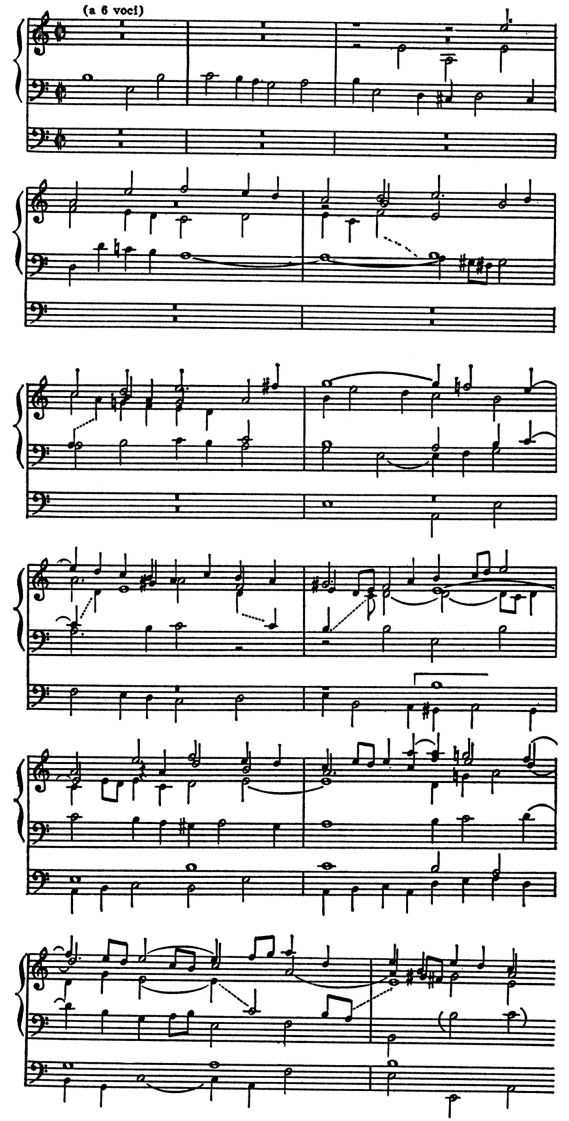 a) И. С. Бах. Бранденбургский концерт No 6, 2-я часть, тема с сопровождающими голосами.