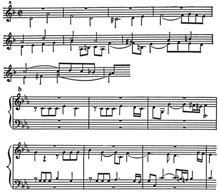 a) И. С. Бaх. Искусство фуги. Contrapunctus I, тема и ответ. b) И. С. Бах. Фуга c-moll на тему Легренци для органа, BWV 574, тема и ответ.
