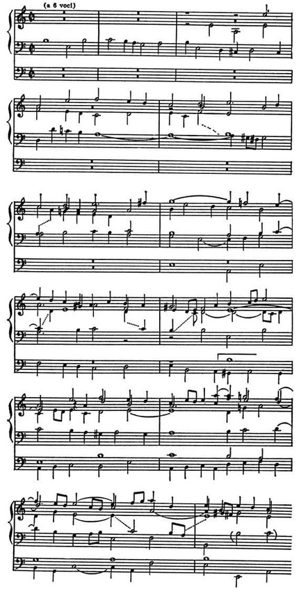 Кроме однотемных, существуют также фуги на 2, реже 3 или 4 темы. Различают Ф. на неск. тем и Ф. сложные (на 2 — двойные, на 3 — тройные); их отличие в том, что сложная Ф. предполагает контрапунктич. сочетание тем (всех или нек-рых). Ф. на неск. тем исторически происходит от мотета и представляет собой последование нескольких Ф. на разные темы (в орг. прелюдии и Ф. a-moll Букстехуде их 2). Такого рода Ф. встречаются среди орг. хоральных обработок; 6-гол. Ф. «Aus tiefer Not schrei’ich zu dir» Баха (BWV 686) складывается из экспозиций, предваряющих каждую строфу хорала и построенных на их материале; такая Ф. называется строфической (иногда применяется нем. термин Schichtenaufbau — построение слоями; см. пример в колонке 989).