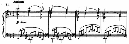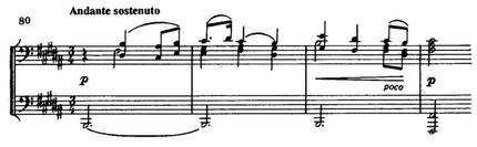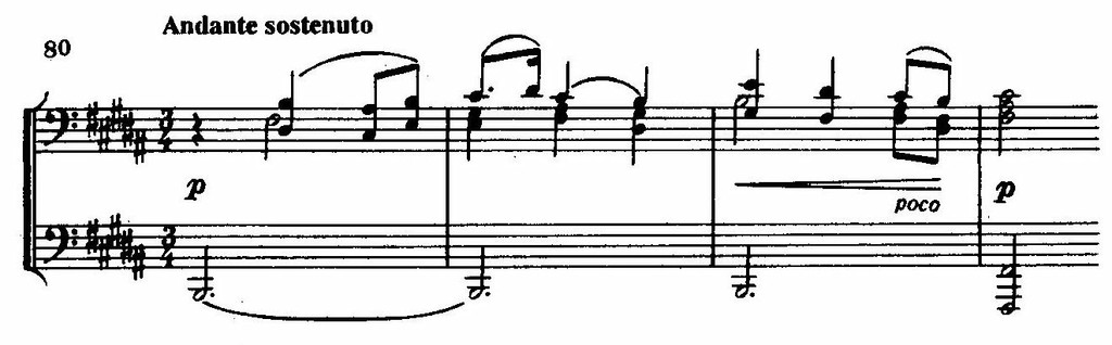Широко и пространно изложенная тема во вступительном Andante sostenuto превращается в главной партии в энергичную стремительно взлетающую октавную фигуру (Allegro, цифра 10). Основой побочной партии, одновременно выполняющей функцию медленной части сонатного цикла (Andante, цифра 24), становится мелодический оборот типа зовов, закликаний, впервые возникающий в переходном построении от вступления к главной партии.