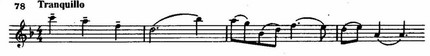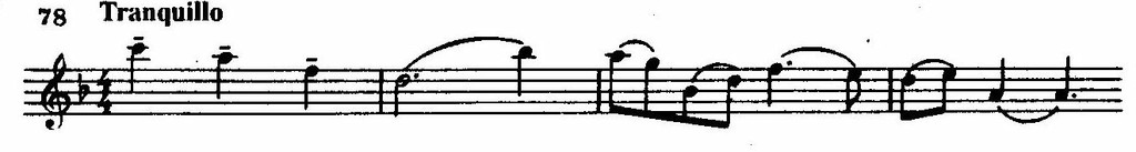 Проходящие хроматизмы (особенно звук IV повышенной ступени во втором такте) заостряют ее лирическую экспрессию, не нарушая, однако, плавного волнообразного развертывания мелодической линии, раскинувшейся более чем на полторы октавы. Более спокойная и светлая тема побочной партии, также излагаемая в партии солиста, содержит некоторые мелодические обороты, родственные первой теме (так, например, нисходящее движение по ступеням малого септаккорда воспроизводится в начале побочной партии в обращении).
