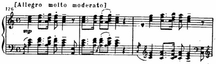 Побочная тема принадлежит к числу характерных для Грига светлых, возвышенных лирических образов. Особую выразительность сообщает мелодии тонкая гармоническая окраска каждого ее оборота, иная гармонизация при повторах фраз, интонаций. Так, в мягком плагальном звучании первой фразы особенно выразительна минорная окраска субдоминанты. Но тут же, при повторе последней интонации положена более интенсивная, яркая краска: D7 с секстой — D9. Вторая фраза, повторяющая рисунок первой,— ее минорный вариант, за которым следует активное секвенционное развитие.