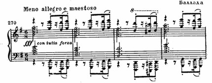 Но и они сметаются порывом отчаяния. Неистовое движение срывается в момент кульминации, и под конец Баллады звучат отголоски скорбной темы.
