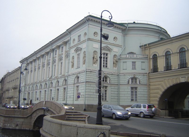 Театральное здание построено в 1783-87 годах (фасад завершён в 1802) в Петербурге (архитектор Дж. Кваренги) в традициях античной архитектуры.