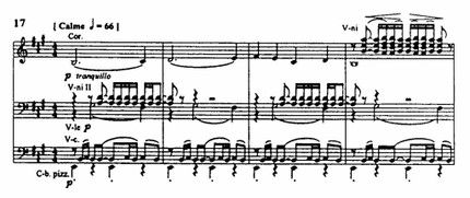 Контрастом к безрадостным «Песне Нигамона» и «Притче об играх мира» явилась прозрачно-светлая «Летняя пастораль» для камерного оркестра — квартета деревянных, валторны и струнных (1920). Ее песенные темы (см., в частности, пример 17), чистые краски, свирельные наигрыши с подголосками, имитирующими птичий гомон и дремотные шорохи, свидетельствуют о преломлении давних французских традиций. Впрочем, птичий щебет вполне ассоциируется и с птицей из вагнеровского «Зигфрида».