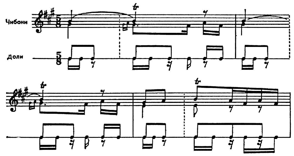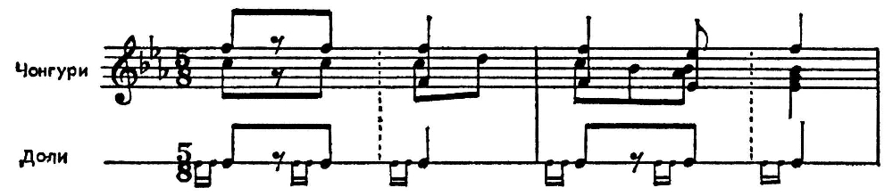 Темп, как правило, умеренный, но так же, как и муз. сопровождение, находится в полной зависимости от развития сюжета танца, в к-ром эпизоды воен. событий (разведка, наступление, победа и т. д.) перемежаются возвращающимся эпизодом «отдыха», что обусловливает рондообразную форму (abcbdb). Отличит. черты X. — сложная метроритмика, пятипольный такт с группировкой 3 + 2 или 2 + 3 (возможны исследования тактов с разл. группировкой: 2 + 3 и 3 + 2). Мелодич. линия состоит из коротких наигрышей, обычно в пределах одного-двух тактов, к-рые, периодически повторяясь, слегка варьируются. X. танцуют в сопровождении чибони (род двухголосного духового инструмента с мехом) или чонгури, иногда вместе с ударным инструментом доли (давли в Аджарии), иногда только в сопровождении последнего.