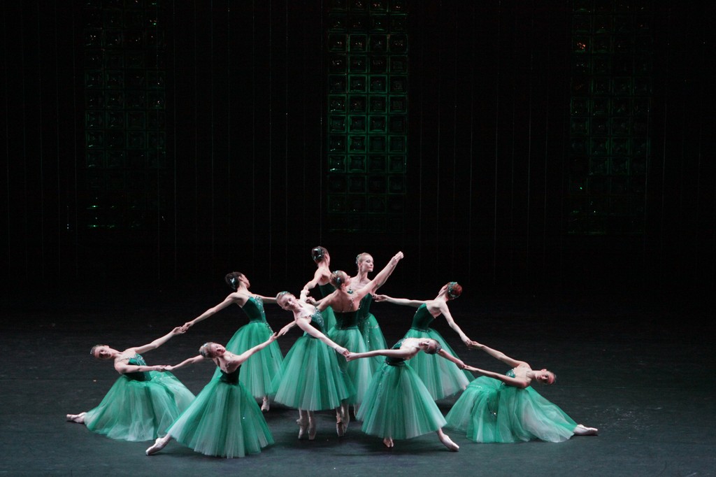 Вот первая пара в «Изумрудах» (Жанна Аюпова и Андриан Фадеев). Кто они? Знатная дама и юный паж, покоренный ее изяществом и услужливо аккомпанирующий ее уверенному, хотя и не слишком интересному танцу? А может быть, такой романтизм наивен, и он лишь наемный танцор на балу? Вторая дама (Вероника Парт) первоначально появляется без кавалера. Да он ей и не нужен: как разукрашенная ладья уверенно и пластично рассекает она изумрудный сумрак, милостиво разрешая нам любоваться своей красотой.
