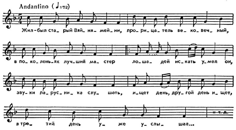 «Жил-был старый Вяйнямейни». Карел. песня (отрывок из рун «Калевалы»). Запись Н. Леви (1937), эквиритмический перевод В. П. Гудкова.