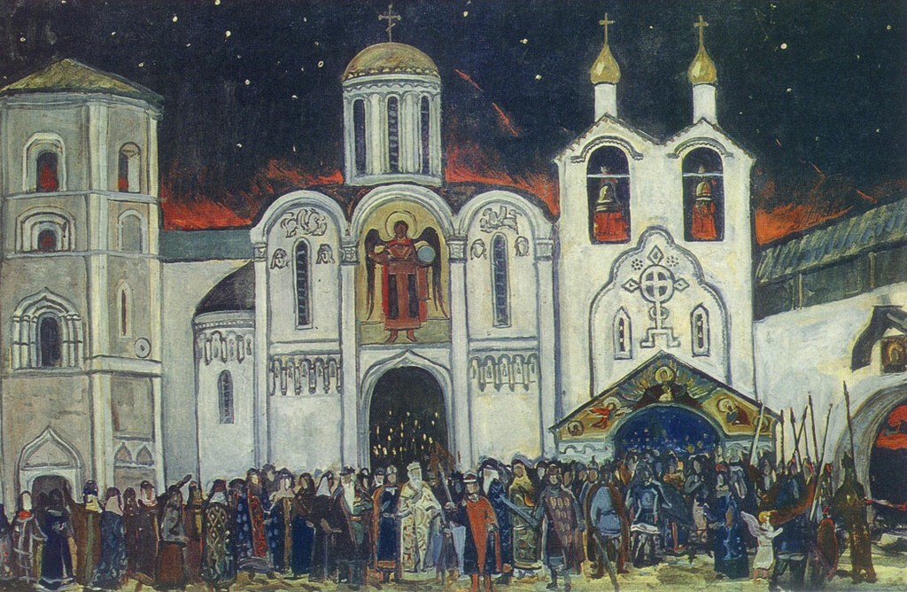 Картина 1. Китеж Великий. В самую полночь весь народ, от старого до малого, с оружием в руках собрался за оградой Успенского собора. На паперти князь Юрий и княжич Всеволод, вокруг них дружина. Все обступили Федора Поярка, который стоит, опустив голову, об руку с Отроком. Выясняется, что он был ослеплен татарами. Всех потрясает его скорбный рассказ о народном бедствии и о том, что, по слухам, ведет татар к Великому Китежу сама княгиня Феврония. Народ подавлен: «Ох, смутилось сердце, братия! Хочет быть беда великая». Князь посылает Отрока на колокольню, чтобы он оттуда посмотрел, «не дает ли Бог нам знаменья». Отрок вбегает на колокольню и оттуда сообщает: «Пыль столбом поднялась до неба». Это мчится ордынское войско. Отроку видится: «Как бы Китеж град горит: пламя пышет, искры мечутся», — с этими и другими кровавыми подробностями он рассказывает о своем видении. По призыву старого князя Юрия народ возносит мольбы о спасении своем Царице небесной. Вперед выступает княжич Всеволод. Он просит отца благословить его с дружиной на ратный подвиг и выступает навстречу врагам. Княжич громко запевает песню воинов «Поднялася с полуночи дружинушка».