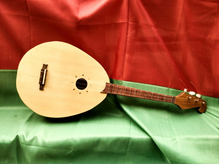 2) Струнный щипковый муз. инструмент румыно-молд. происхождения. Имеет слегка вытянутый, грушевидный корпус (дл. ок. 500 мм, ширина ок. 300 мм), короткую (не более 150 мм) шейку с металлич. ладами и отогнутую назад головку, 4 металлич. струны (1-я и 3-я двуххорные, 2-я и 4-я трёххорные). Строй квартовый. Играют плектром. Используется как сольный, ансамблевый и орк. инструмент в Румынии, Молдавии, Венгрии.