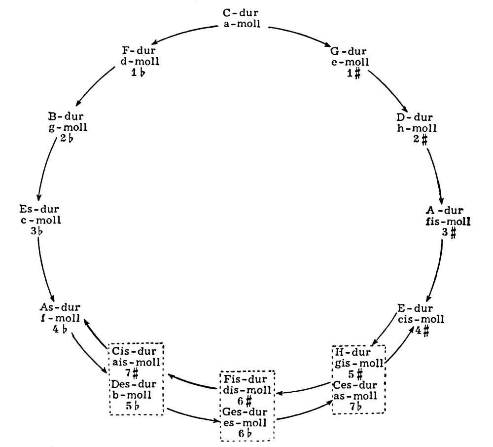 Квинтовый круг наиболее употребительных мажорных и минорных тональностей (пунктиром обозначены ангармонически равные тональности).