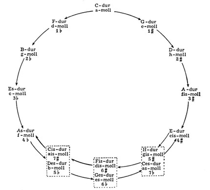 Движение в противоположном направлении по К. к. даёт 12 мажорных бемольных тональностей; в этом случае энгармонически равной до мажору тональностью будет ре дубль-бемоль мажор (Deses-dur, 12 бемолей). Практически же в музыке благодаря энгармонизму К. к. замыкается, образуя общий круг диезных и бемольных мажорных тональностей, а также общий круг диезных и бемольных минорных тональностей. тональностей.