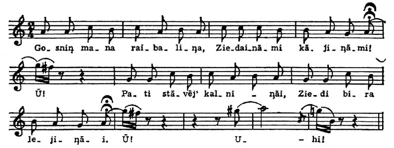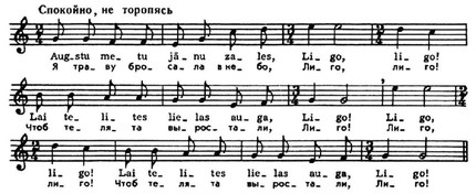 Древнейшие данные о латыш. нар. музыке относятся к 11–12 вв. (археологич. раскопки). В 1632 впервые была опубликована латыш. нар. мелодия с текстом (в кн. Frid. Menii, Syntagma de origine livonorum, Dorpati). Однако систематич. собирание и изучение латыш. нар. музыки началось лишь с 70-х гг. 19 в. и особенно в 20 в. латыш. нар. песенные жанры включают в себя широкий круг трудовых песен (пастушеские, пахарей, сенокосные, жатвенные, при работах над льном, толочные, молотильные, помольные, рыбацкие, посиделочные и др.), календарные обрядовые (зимние колядки, кекатас, будели, весенние роташанас с припевом «рота!», популярнейшие купальские лиго или «песни Яниса» с припевом «лиго!»), семейные обрядовые (крестинные, свадебные, похоронные), лирические и шуточные бытовые (детские, молодёжные, сиротские, солдатские и др.), хороводные, танцевальные.