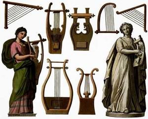 1) Древнегреческий струнный щипковый муз. инструмент. Корпус плоский, округлой формы; первоначально изготовлялся из панцыря черепахи и снабжался мембраной из кожи быка, позднее выделывался целиком из дерева. По бокам корпуса — две изогнутые стойки (из рогов антилопы или из дерева) с перекладиной, к-рой крепились 7–11 струн. Настройка по 5-ступенному звукоряду. При игре Л. держали вертикально или наклонно; пальцами левой руки исполняли мелодию, а в конце строфы проводили плектром по струнам. Игрой на Л. сопровождали исполнение произв. эпич. и лирич. поэзии (с Л. связано возникновение лит. термина «лирика»). В противоположность дионисийскому авлосу Л. была инструментом аполлоническим. Дальнейшей ступенью развития Л. явилась кифара (китара). В ср. века и позднее антич. Л. не встречалась.