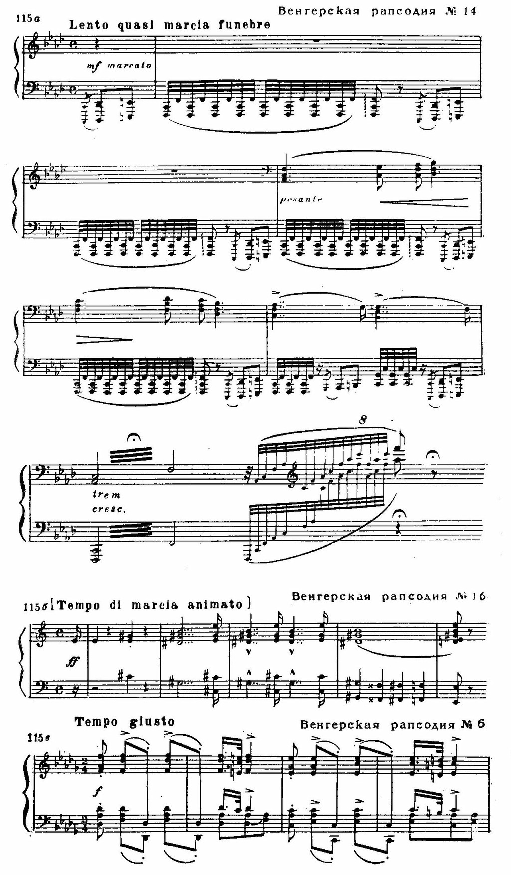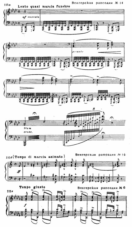 Правда, он не был первым, кто ввел это обозначение в фортепианную музыку; с 1815 года рапсодии писал чешский композитор В. Я. Томашек. Но Лист придал им иное толкование: под рапсодией он разумеет виртуозное произведение в духе парафразы, где вместо оперных мелодий используются народно-песенные и танцевальные мотивы. Своеобразием отмечена и форма листовских рапсодий, основанная на контрастном сопоставлении двух разделов — медленного и быстрого: первый более импровизационного склада, второй — вариационный . (Любопытно, что аналогичное соотношение частей Лист сохраняет в «Испанской рапсодии» (около 1876 года): медленная часть (cis-moll) построена на варьировании темы фолии, близкой сарабанде; быстрая часть (D-dur) также основана на вариационном принципе, но в последовании тем обнаруживаются черты свободно трактованной сонатной формы (главная партия — D-dur, побочная — F-dur, заключительная — E-dur).)