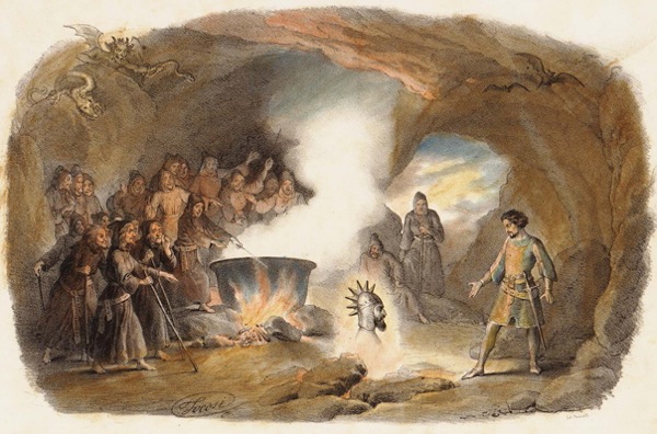 Макбет решает узнать свою судьбу у Гекаты и отправляется в логово ведьм. В ответ на свой вопрос он слышит три пророчества: Макбет должен избегать встреч с Макдуфом, таном Файфа, Макбета не сможет победить никто, рожденный женщиной; Макбет может быть спокоен, пока на него не двинется Бирнамский лес… Рыцарь успокаивается — еще не было случая, чтобы лес двинулся с места. Однако, он хочет услышать еще одно пророчество. Макбету является видение — восемь юношей, держащих зеркала и увенчанных коронами — символ грядущего. В последнем из них рыцарь узнает Банко. Макбет выхватывает меч, чтобы поразить его, но видение исчезает. Испуганный рыцарь теряет сознание. Когда он приходит в себя, ведьмы и духи исчезают. Появляется леди Макбет. Муж передает ей слова пророчества. Замок файфского тана Макдуфа должен сгореть дотла.