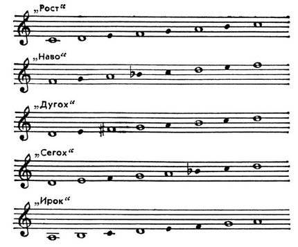 (белыми нотами выделены опорные ступени каждого звукоряда).
