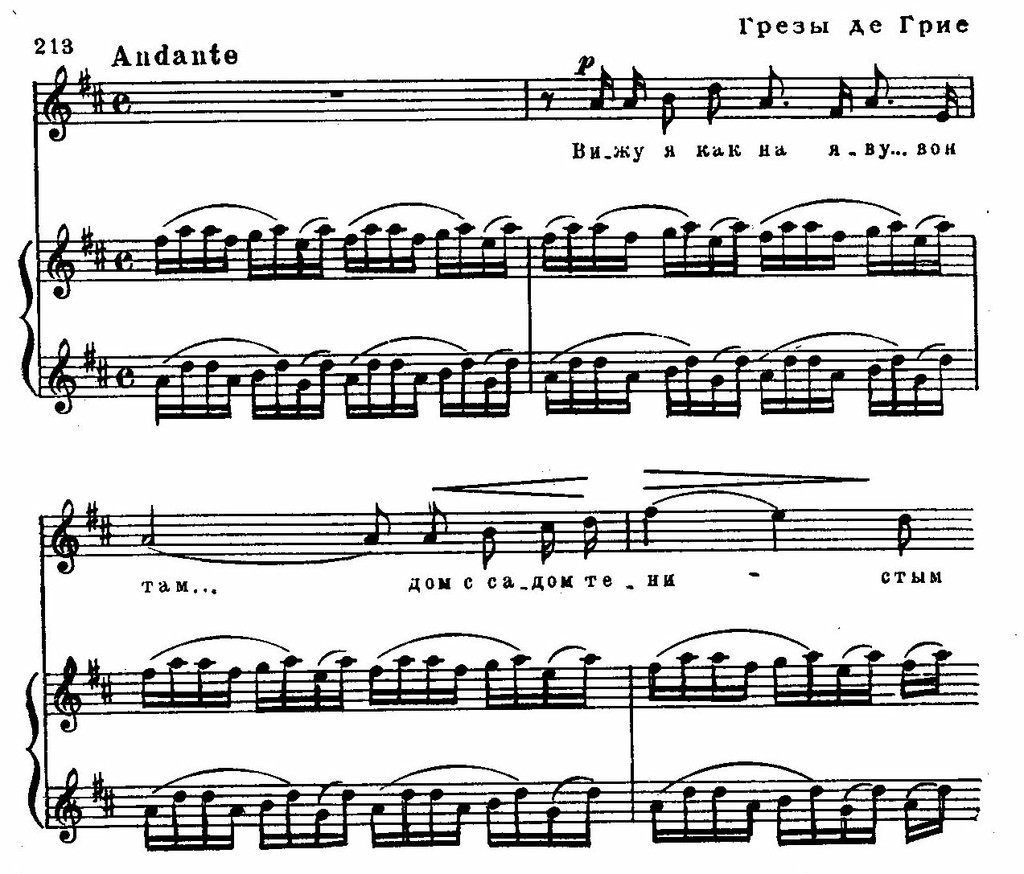Образ Манон зарисован преимущественно пастельными красками, хрупкими мелодическими линиями, в которых речитативы, проникнутые разговорными интонациями, объединены с краткими напевными фразами (см. пример 211). Таково первое ариозо (B-dur) — выход Манон «Как объяснить вам, я не знаю»: запинающаяся, несмелая речь передана при помощи частых пауз, постоянной смены оттенков, темпа, склада мелодики — речитативно-разго- ворной и мелодически-распевной. Второе ариозо (h-moll) — жалоба Манон — более разнообразно по настроению, вследствие чего богаче и в модуляционном отношении, но сохраняются те же мелодико-интонационные принципы построения. Кульминация I акта — любовный дуэт Манон и де Грие, хорошо оттеняемый вторжением массовой сцены.