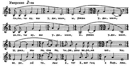 Типична 2-частная куплетная форма песен из 2 периодов (2-й повторяет весь материал 1-го квинтой ниже, реже — квартой выше). В совр. нар. песнях наблюдается тяготение к единой метрич. организации. Инстр. нар. музыка тесно связана с развитием танца и песенным творчеством. Среди нар. инструментов наиболее распространены: кусле (гусли), шувыр (волынка), тумыр (барабан), шиялтыш (свирель), пуч (виды берестяных и деревянных труб), шушпык (глиняный соловей), ковыж (2-струн. скрипка).
