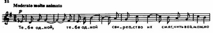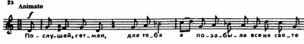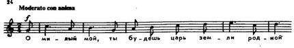 В противоположность этому ответы Мазепы невозмутимо ровны по тону и облечены в форму законченного ариозного построения, повторяемого без изменений в той же тональности ми мажор. Наконец, чтобы успокоить свою возлюбленную, он решается рассказать ей о вынашиваемых им честолюбивых планах. Это вызывает у нее прилив бурного восторга: в устах Марии появляется новая светлая ликующая мелодия со стремительным взлетом на «мажорную сексту» (Заметим, что подобный или похожий мелодический оборот неоднократно применялся Чайковским для выражения восторженного порыва или твердой решимости: например, фраза Татьяны «Пускай погибну я» в сцене письма из «Евгения Онегина» или средний раздел арии Иоанны в первом действии «Орлеанской девы».),