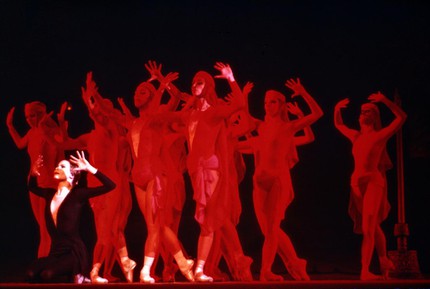 Особое значение приобретает танец кордебалета, сопровождающий монолог Мехменэ. Она танцует в черном костюме, и ее неотступно сопровождает вереница женщин в красных одеждах. Это пластическое, зримое воплощение страстей и раздумий измученной, страдающей царицы. В танце женщин есть и торжественное величие античного хора, и порывистость обезумевших вакханок, и усталая безнадежность трагических плакальщиц. Они строго и в то же время «издевательски» повторяют ее скорбные и мятущиеся движения, словно передразнивают отчаянные изломы ее тела, как бы многократным пластическим эхом повторяя ее вопли и стоны, зеркально отражая ее горестные и гневные порывы. В ней самой и уже независимо от нее живут десятки преследующих, измученных и неумолимых фурий.