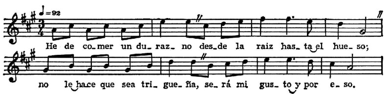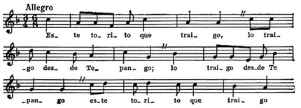 В песенном фольклоре наряду с многообразными лирич. формами большое место занимают песни общественного, гражданственного звучания, — патриотические, политические, исторические. Среди них ведущая роль принадлежит корридо — песне эпико-повествоват. характера, типа баллады, восходящей к испан. романсу. В период бурж.-демократич. революции 1910–17 сложился особый вид революц. корридо, воспевающих героев нац.-освободит. движения и идеалы революции. Традиц. муз. инструмент — гитара. Её местные разновидности — гитаррон (гитара размером почти вдвое больше обычного) и харанита (маленькая гитара с 4 или 5 двойными струнами). Почти не уступает гитаре в популярности арфа (старинной конструкции, диатоническая, без педалей); нар. музыкантами любима также скрипка.
