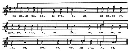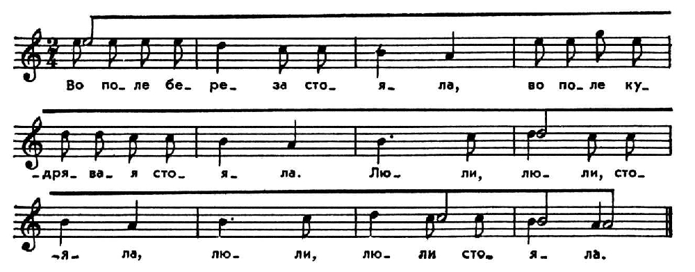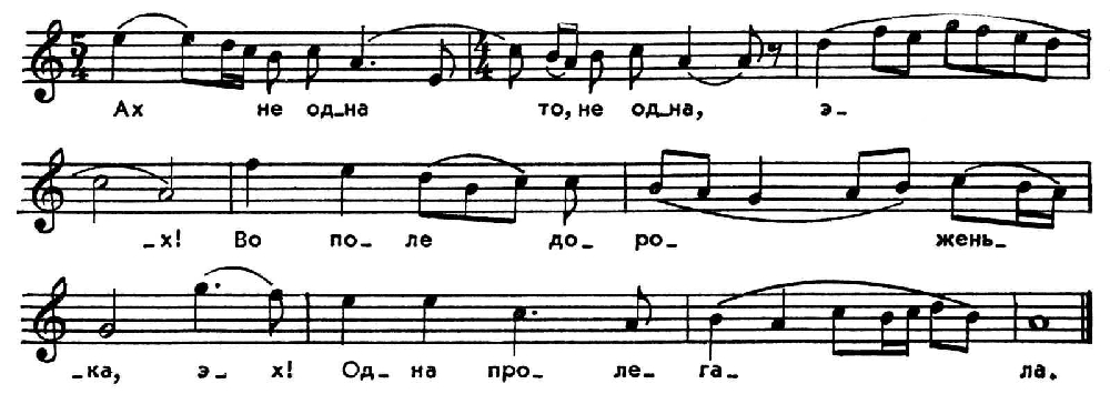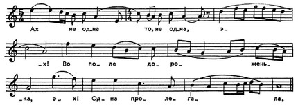 IV. Этапы развития мелодики совпадают с осн. этапами истории музыки в целом. Истинный исток и неисчерпаемая сокровищница М. — нар. муз. творчество. Нар. М. являются выражением глубин коллективного нар. сознания, возникающей естественным путём «природной» культурой, к-рая питает проф., композиторскую музыку. Важную часть рус. нар. творчества составляют отшлифованные веками старинные крестьянские М., воплощающие первозданную чистоту, эпич. ясность и объективность нар. мировосприятия. Величавое спокойствие, глубина и непосредственность чувства органически связаны в них со строгостью, «истовостью» диатонич. ладовой системы. Первичный структурный остов М. русской народной песни «Не одна во поле дороженька» (см. пример) — гаммовая модель с2-h1-a1.