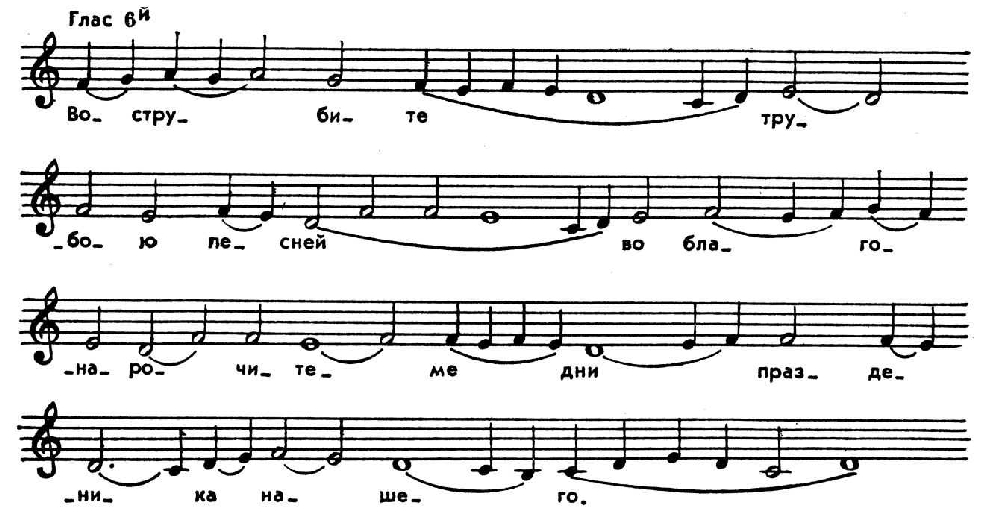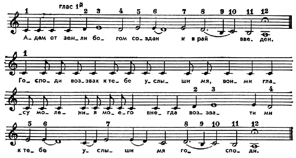 Мелодика древнерус. певч. иск-ва типологически представляет собой параллель западному григорианскому хоралу, но резко отличается от него по интонационному содержанию. Поскольку заимствованные первоначально из Византии М. не были твёрдо фиксированы, то уже при перенесении их на рус. почву, а тем более в процессе семивекового бытования гл. обр. в устной передаче (так как крюковая запись до 17 в. не обозначала точной высоты звуков) под непрерывным воздействием нар. песенности они подверглись коренному переосмыслению и в дошедшем до нас виде (в записи 17 в.), несомненно, превратились в чисто рус. явление. Мелодии старых мастеров — ценное культурное достояние рус. народа. («С точки зрения музыкального своего содержания древнерусский культовый мелос ценен ничуть не меньше памятников древнерусской живописи», — отмечал Б. В. Асафьев.) Общая основа ладовой системы знаменного пения, по крайней мере с 17 в. (см. Знаменный распев), — т.н. обиходный звукоряд (или обиходный лад) GAH cde fga bc’d' (из четырёх «согласий» одинаковой структуры; звукоряд как система — не октавный, а квартовый, его можно трактовать как четыре ионийских тетрахорда, сочленённых слитным способом). Большинство М. классифицируется по принадлежности к одному из 8 гласов. Глас есть совокупность определённых попевок (их несколько десятков в каждом гласе), сгруппированных вокруг своих мелодич. тоник (по 2–3, иногда и более для большей части гласов). Внеоктавность мышления отражается и на ладовой структуре. М. может состоять из ряда узкообъёмных микроладовых образований в пределах единого общего звукоряда. Линия М. характеризуется плавностью, преобладанием гаммового, секундового движения, избеганием скачков внутри построения (изредка встречаются терция и кварта). При общем мягком характере выражения (надлежит «пети кротким и тихим голосом») мелодич. линия крепка и сильна. Древнерус. культовая музыка всегда вокальна и преимущественно одноголосна. Выразит. произнесение текста определяет ритмику М. (выделение ударных слогов в слове, важных по смыслу моментов; в конце М. обычен ритмич. каданс, гл. обр. с помощью крупных длительностей). Размеренная ритмика избегается, ритм крупного плана регулируется длиной и членением строк текста. Мотивы-попевки варьируются. М. доступными ей средствами иногда изображает те состояния или события, о к-рых говорится в тексте. Вся М. в целом (а она может быть и очень длинной) строится по принципу вариантной разработки попевок. Вариантность состоит в новом проведении попевки со свободным повторением, изъятием, прибавлением отд. звуков и целых звуковых групп (см. пример погласицы и псалома). Мастерство распевщика (композитора) проявлялось в умении создать длинную и разнообразную М. из огранич. количества положенных в основу мотивов. Принцип неповторности относительно строго соблюдался древнерус. мастерами пения, новая строка должна была иметь новый напев (мелопроза). Отсюда огромное значение вариационности в широком смысле слова как метода развития. Пример древнерус. M. (начальный фрагмент):