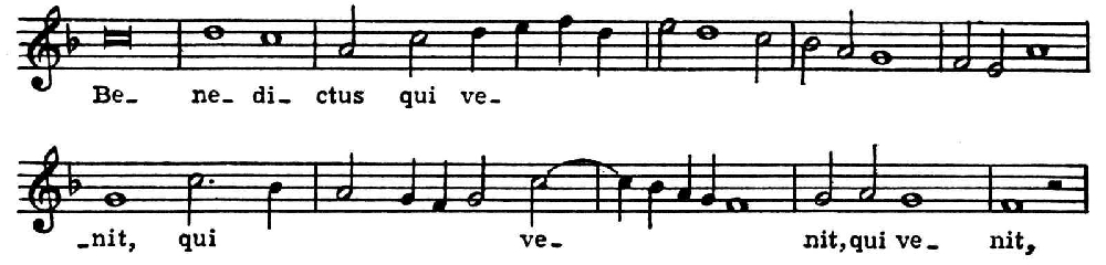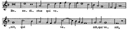 Мелодика григорианского хорала (см. Григорианское пение) отвечает своему христианско-литургич. назначению. Содержание григорианских М. полностью противоположно иск-ву языческого антич. мира. Телесно-мускульному импульсу М. античности противостоят здесь предельное отрешение от телесно-двигат. моментов и сосредоточение на смысле слова (понимаемого как «божеств. откровение»), на возвышенном размышлении, погружение в созерцание, самоуглубление. Поэтому в хоральной М. отсутствует всё, что подчёркивает действие — чеканный ритм, мерность членения, активность мотивов, сила тонального тяготения. Григорианский хорал — культура абсолютной М. («единение сердец» несовместимо с «разномыслием»), не только чуждой какой-либо аккордовой гармонии, но вообще не допускающей никакого «многогласия». Ладовая основа григорианских М. — т.н. церковные тоны (четыре пары строго диатонич. ладов, классифицирующихся по признакам финалиса — конечного тона, амбитуса и реперкуссы — тона повторения). Каждый из ладов, кроме того, связан с определённой группой характерных мотивов-попевок (концен- трированных в т.н. псалмодич. тонах — toni psalmorum). Введение попевок данного лада в различные относящиеся к нему М., как и мелодич. варьирование в нек-рых видах григорианского пения, родственно древнему принципу макама. Уравновешенность линии хоральных М. выражается в часто встречающемся аркообразном её построении; начальная часть M. (initium) представляет собой восхождение к тону повторения (tenor или tuba; также repercussio), а заключительная — нисхождение к конечному тону (финалису). Ритмика хорала точно не фиксируется и зависит от произнесения слова. Соотношение текста и собственно муз. начала обнаруживает два осн. типа их взаимодействия: речитацию, псалмодирование (lectio, orationes; accentue) и пение (cantus, modulatio; concentus) с их разновидностями и переходами. Пример григорианской М.: