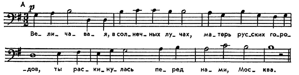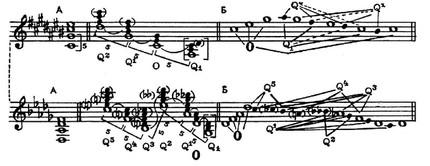 Ко всем этим слоям структуры прибавляется последний — аккордовая гармония, проецированная на одноголосную линию с помощью использования для построения М. новых, не только одноголосных, но и многоголосных моделей. Сжатая в линию гармония стремится приобрести свою естественную многоголосную форму; поэтому М. «гармонической» эпохи почти всегда рождается вместе с ею же самой регенерируемой гармонией — с контрапунктирующим басом и заполняющими средними голосами. В следующем примере на материале темы фуги Cis-dur из 1-го тома «Хорошо темперированного клавира» И. С. Баха и темы из увертюры-фантазии «Ромео и Джульетта» П. И. Чайковского показано, как аккордовая гармония (А) становится мелодич. моделью лада (Б), к-рая, воплотившись в М., воспроизводит скрытую в ней гармонию (В; Q 1, Q2, Q3 и т. д. — аккордовые функции первой, второй, третьей и т. д. верхних квинт; Q1 — соответственно квинты вниз; 0 — «ноль квинт», тоника); анализ (методом редукции) в конечном счёте обнаруживает её центральный элемент (Г):