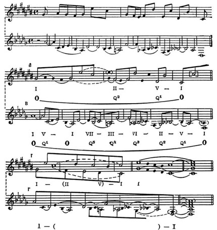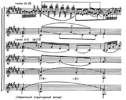 Начальная мелодич. доминанта as1 украшается вспомогат. звуком (обозначен буквой «в»); каждый структурный тон (кроме последнего) даёт жизнь прорастающим из него мелодич. «побегам»; окончание лини и структурного остова (звуки es-des) перенесено в др. октаву. В результате мелодич. линия становится богатой, гибкой, не теряя вместе с тем цельности и единства, обеспечиваемых изначальным движением секунд в рамках созвучия as1- des-1 (des2).