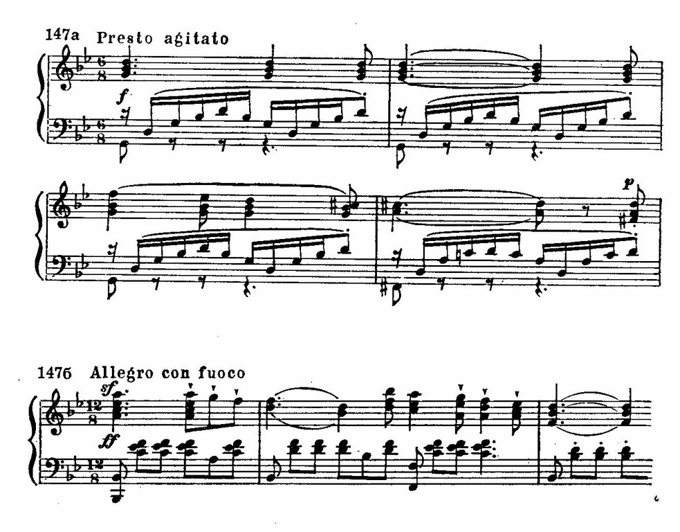 Наиболее «видным» признаком, условно объединяющим каждую группу пьес, служит темповое обозначение. Медленное или умеренно медленное движение типично для первой группы; для второй — обычны разновидности быстрого темпа (Presto agitato, Agitato е con fuoco и т. п.).