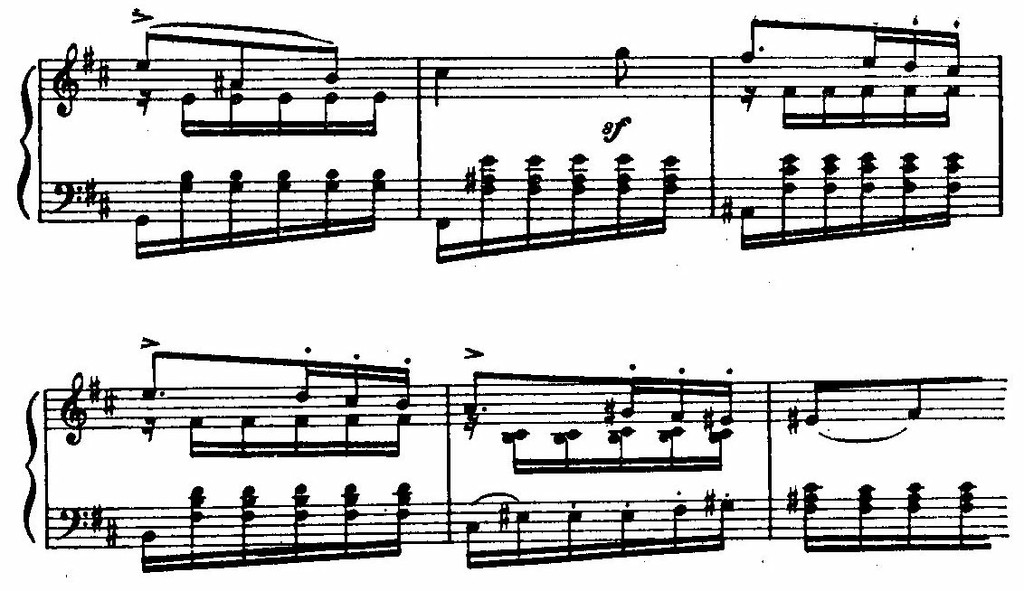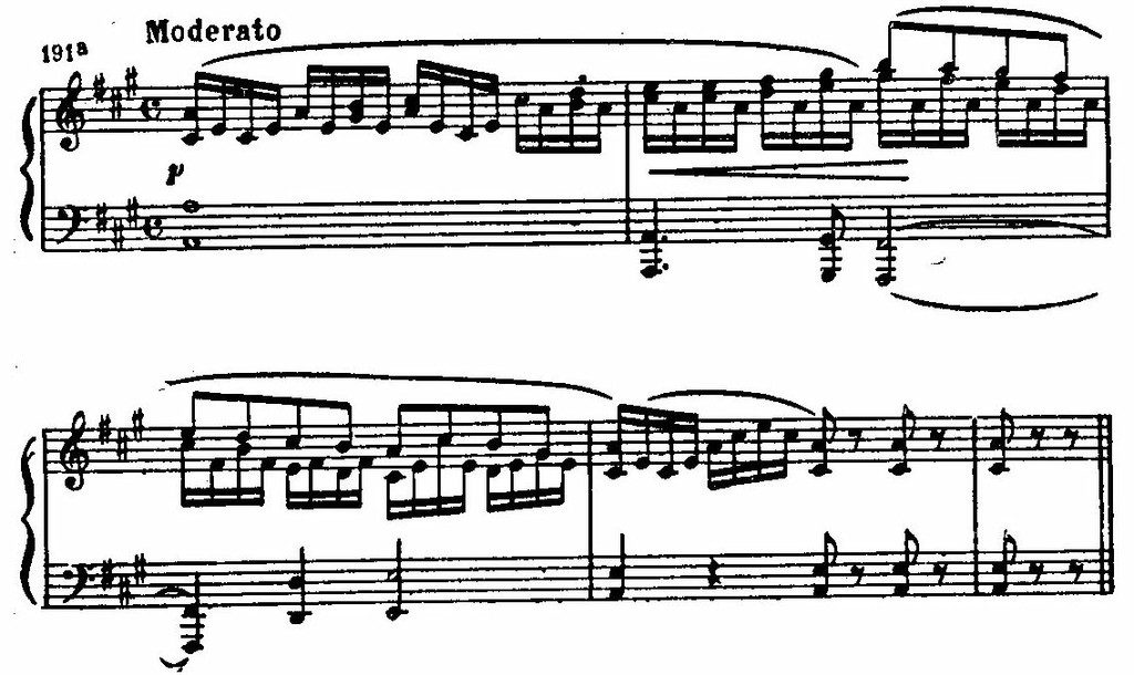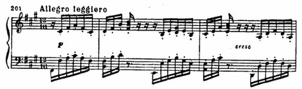 Характерные «пробеги» через сильную долю, устремленность мелодии к «щипковому» аккорду в левой руке, своеобразные перебои акцентов выявляют народно-импровизационную природу этого наигрыша, может быть, гитарного: