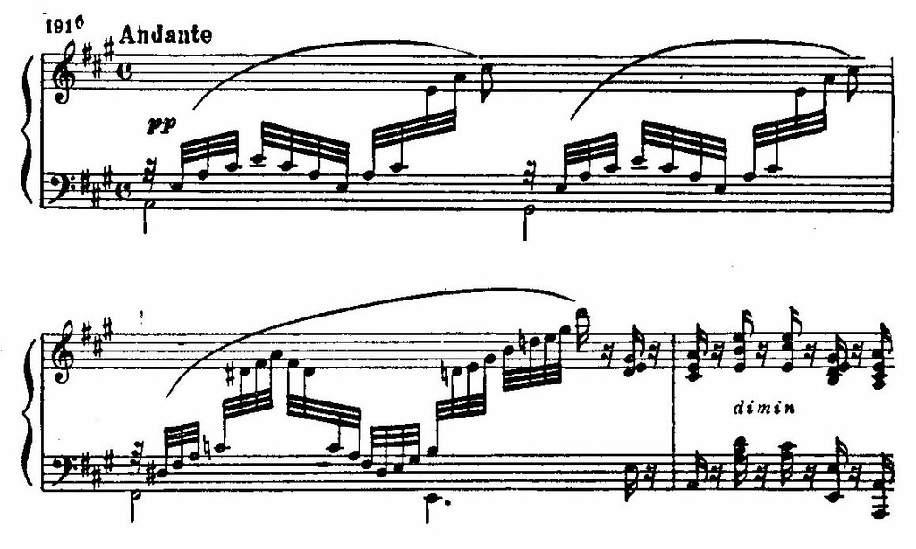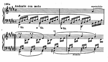 Напряжение сдерживаемого чувства раскрывается в дальнейшем движении мелодии, в акцентировании вводнотоновых тяготений (фраза, примыкающая к первому обороту), в расширенной интервалике последующих фраз и особенно в момент первой кульминации, замыкающей цепь секвенций первой части: