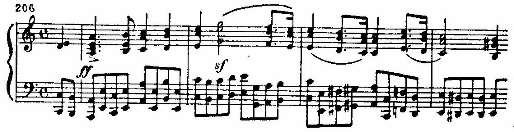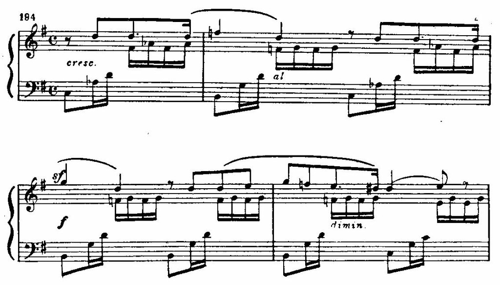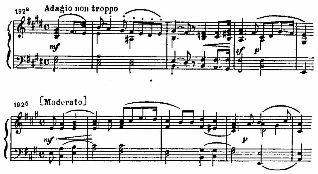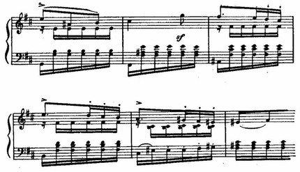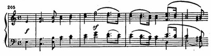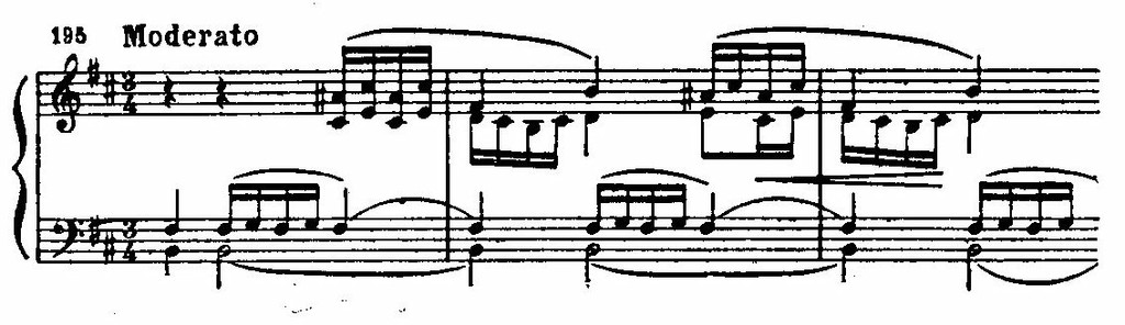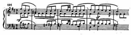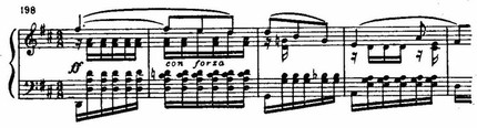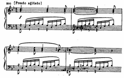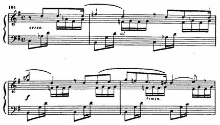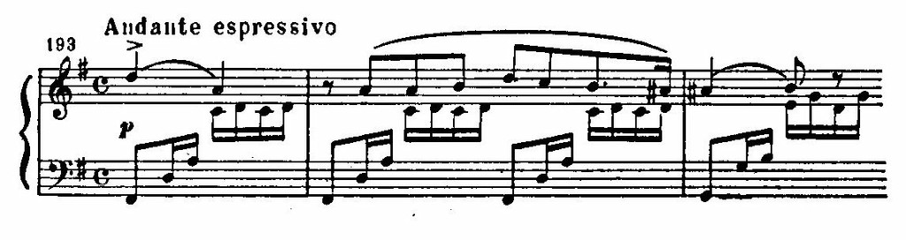 Неожиданный сдвиг в D-dur и появление нового музыкального материала разрешают напряжение, образованное цепью восходящих секвенций в мелодии, «наталкивающихся» на сопротивление доминантового баса fis-moll. Этот открыто экспрессивный момент — кульминация первой части: