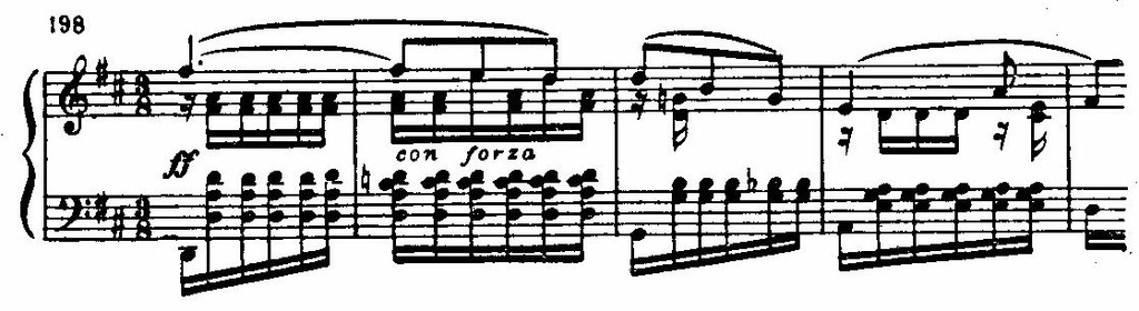 Доминантовая гармония служит моментом «сцепления» наигрыша и песенной темы; в каждом проведении элемент разработочности усиливается, одновременно раздвигается и диапазон фортепианного звучания. Третье, последнее, проведение песенной темы, приобретающей эпическую силу — общая кульминация пьесы: