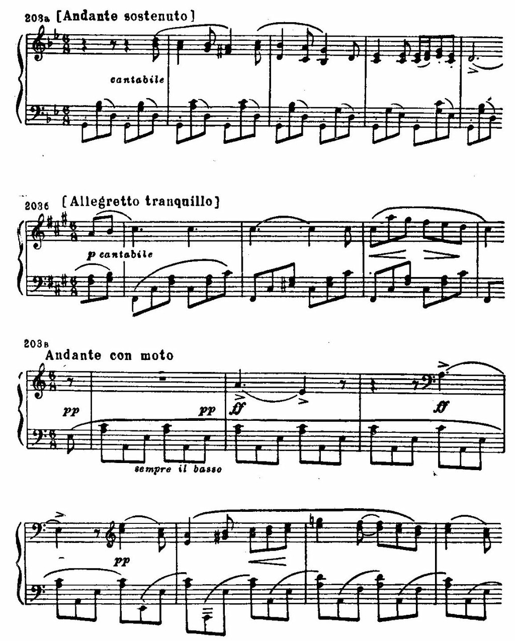 Первые две пьесы — № 6, g-moll и № 12, fis-moll — несколько иллюстративны. Это как бы небольшие транскрипции, в которых переложены на фортепиано бытующие в Италии напевы баркарол.