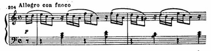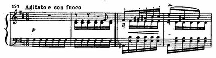 Пьеса № 10, h-moll, Agitato е con fuoco — порывистая, взволнованно-страстная. Дробная, возбужденно-пульсирующая ритмическая фигура первых тактов вступления дает тон пьесе и объединяет ее непрерывностью своего движения. Порывистая, страстная мелодия, то устремляясь вверх, то опускаясь к исходным звукам, как бы вращается в замкнутом круге: