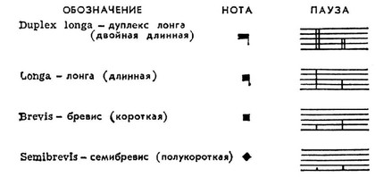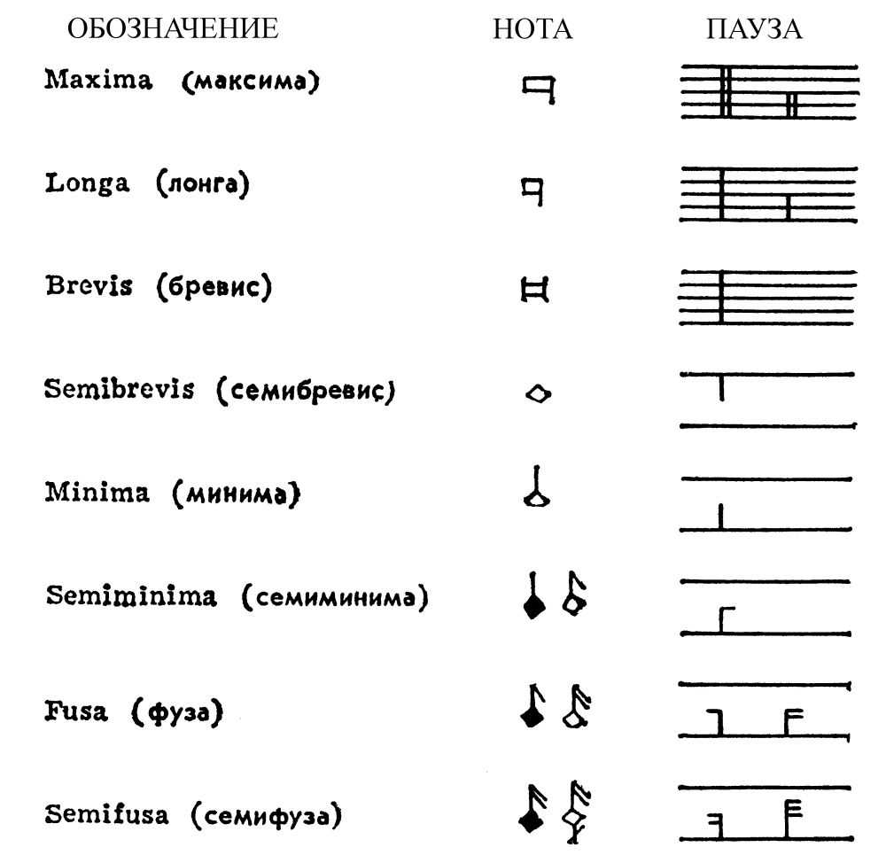 К кон. 13 в. для обозначения длительности звуков и пауз в М. н. применялись следующие знаки (даны в порядке убывания длительности; все термины — латинские):