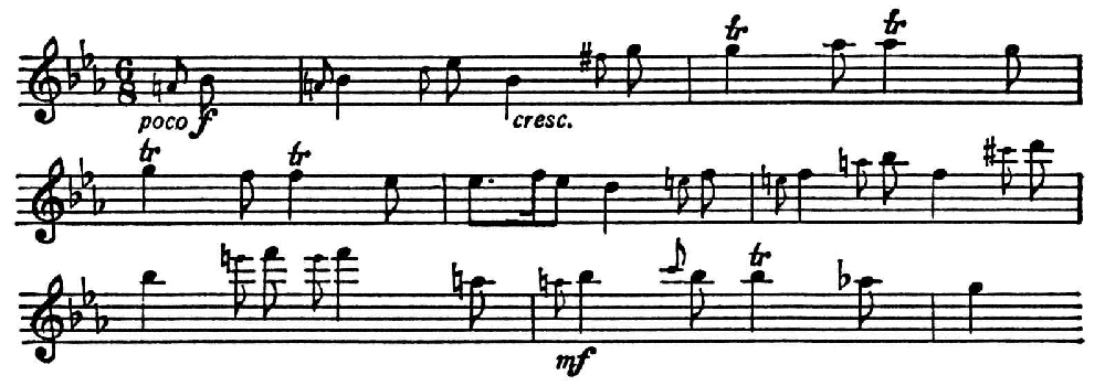 Так, например, в симфонической поэме «Прелюды» (1848–54) короткий мотив из 3 звуков, открывающий собой вступление, далее соответственно поэтич. программе ложится в основу очень разл., контрастных тематич. образований: