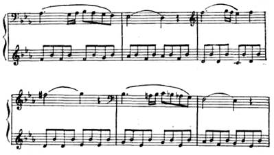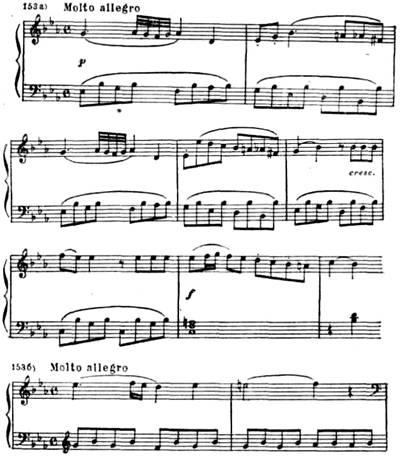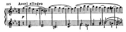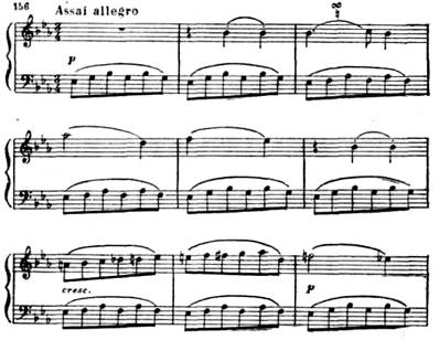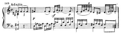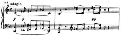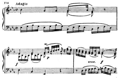 Вторая часть. В медленной, светлой по музыке, второй части (Adagio) получает развитие лирический образ побочной партии первой части в ее экспозиционном изложении (тональность второй части тоже ми-бемоль мажор, см. пример 154). Написана эта часть в сложной трехчастной форме. Первая и основная ее тема при каждом повторении расцвечивается новым тончайшим филигранным узором, внутренне обогащающим эту тему: