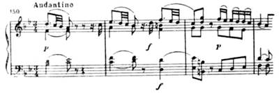 Если разделы драматически напряженные тонально неустойчивы, то лирические разделы, напротив, устойчивы в тональном отношении и конструктивно закончены. Так, этот ре-мажорный раздел написан в двойной трехчастной форме (с повторенной серединой и репризой).