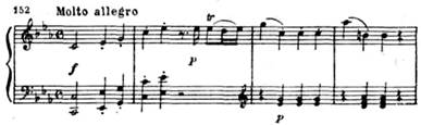 Тема побочной партии как по фактуре, так и в интонационном и в тональном отношении родственна связующей и побочной партиям экспозиции первой части:
