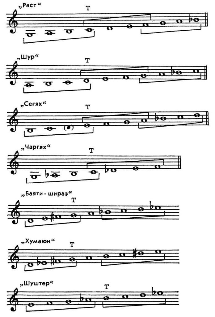 Каждый из них имеет особое название: «Раст», «Шур», «Сегях», «Чаргях», «Баяти-шираз», «Хумаюн» и «Шуштер». Все лады строятся из пяти различных по структуре тетрахордов, соединяемых определ. способом.